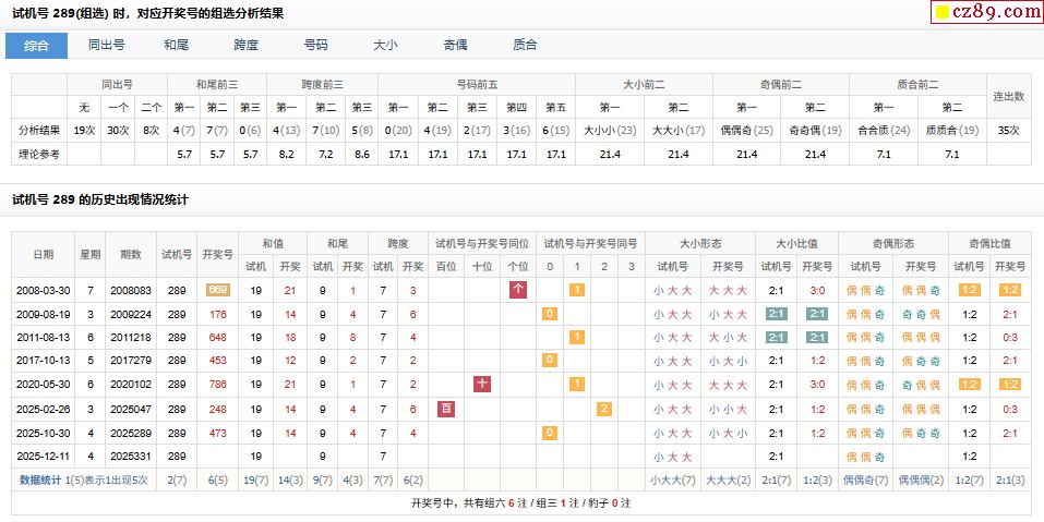 331期福彩3D试机号289对应开奖号的组选分析结果